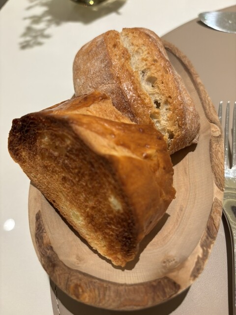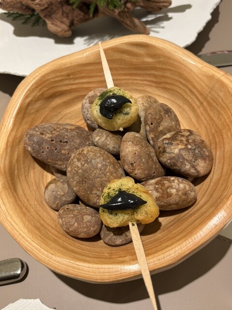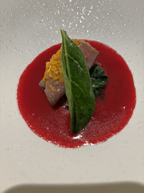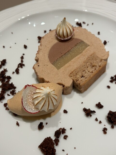 料理はガニェールを知らないから,偉そうなことは言えないが,巷間伝わる「一つのテーマを異素材の組み合わせで異なる食感,温度,風味のコントラストを多皿構成で提供する」料理そのものであった.40年近く前にヌーヴェルキジィーンヌの登場で受けた衝撃の再来のようなものではないかと思った.前菜は6種で冷菜から温菜へ,スプーンに乗せられたものから,グラスに入った,あるいは串に刺したものへと食べ方にも変化をつける.食材の組み合わせも絶妙である.甘みたっぷりの牡丹海老に紅芯大根にミミガーを添えて海老パウダーを振る、牡蠣を牛肉で巻いてビーツのソースで,鹿のローストに生のマイカを乗せてチョコレートを混ぜたソースてと,変幻自在である。私の好きなフォアグラのソテーもありきたりではなく数種類のフンギにワインソースに佐久の粒胡椒がはいっている,チコリにはエスカルゴが忍んでいる,という具合である。ソースは全般に軽めである。