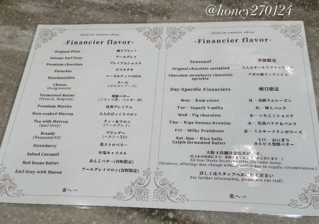 初めて行った時は試食がない日だったので、2回目以降で試食をいただいた日は特別感もあって、ちひろのフィナンシェを買えたことに加えて更にhappyになりました(^^)