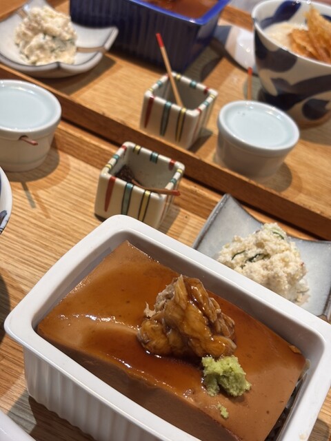 「とうめし」は、ご飯の上に丸ごとの豆腐がどんっと乗り、鯛ほぐし身がアクセントになっていて、豆腐の優しさと魚の旨みが重なって「え、こんな豆腐体験ある?」と唸る一皿です。