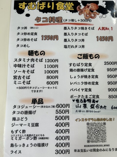 墨入りタコそばと塩だれタコ丼を注文。どちらもタコの弾力がすごく歯応え十分。全体的にしっかりとした味付けで、タコそばは上の具材がニンニクがガツンと効いていてパンチのある味ですが、スープはまろやかでその対比が絶妙!