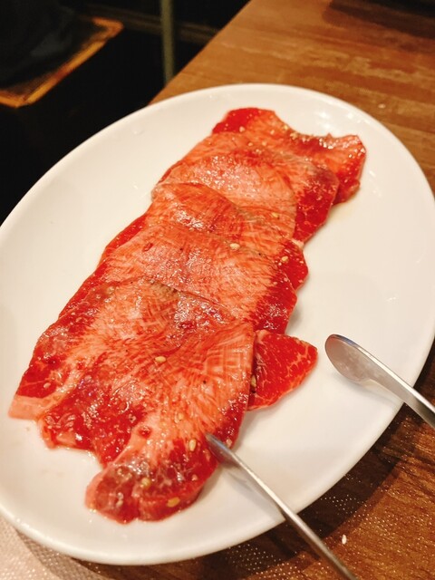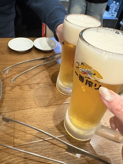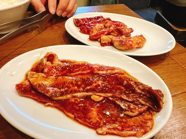 まずは、上タンとキムチ、そして肉一ハラミ2人前。私は2杯目のビール、連れはライス大とワカメスープ。2巡目のお肉は肉一ハラミと、和牛カルビ。そして〆のビール。