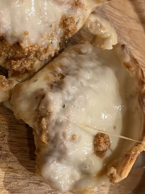 オリジナルシカゴピザホワイトは、直径約15cmほどあり、2人でシェアしていただくにはちょうど良いサイズでした。ピザに切り目を入れると、凹み部分に注がれた大量のチーズが滝の様に流れ出てきました。また更に深く切り目を入れていくと、チーズの下に埋まっていたミートソースも流れ出てきました。ピザを持ち上げると、チーズがこれでもかと長く伸び、見ているだけで美味しさが伝わってきました。いただいてみると、チーズがとても濃厚で、下のミートソースも挽き肉がぎっしり入っており、トマトソースに挽き肉の旨味が良く出ていたため、お肉の甘さがミートソースから伝わってきました。またピザ生地は薄めのため、中のチーズとミートソースがより強調されており、チーズとミートソースに溺れることができました。チーズ好きの方には是非食べていただきたいです。