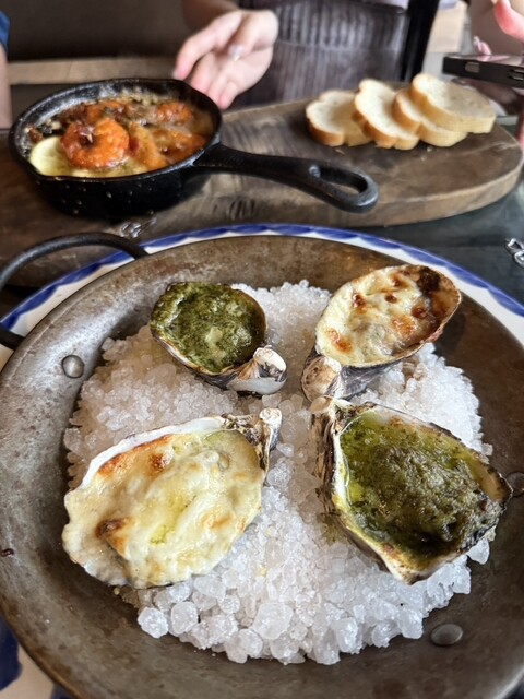 牡蠣やお肉が美味しいって聞いていたので注文しました。焼き牡蠣は色んなフレーバーが選べるの。ゴルゴンゾーラの牡蠣がお気に入り。そしてトマホークグリルは骨付きでお肉の旨みが凝縮されてる!アヒージョやパエリアも本格的で美味しかった!お店の看板メニューにブルスケッタはおかわりしたい美味しさでした。