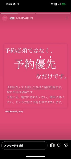 予約推奨のお店(予約必須ではない)で、インスタ→LINEで行きたい日と時間帯を予約出来る。