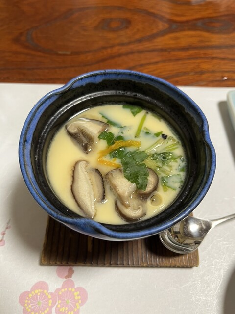 蓋を開けた瞬間から広がる出汁としいたけの香りはとても美しく、表面も気泡がなく、とても味わいの深い味です。食べ進めていくと、鶏胸肉と海老と銀杏が入っていてそれぞれがとてもちょうどいい火入れでものすごく美味しいです。