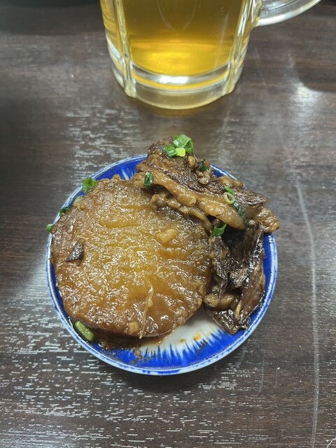 牛すじの旨みと甘みがものすごく染みた大根は、形が崩れておらず見た目も綺麗ながら、牛すじと一緒に口に入れた瞬間ホロリと解けます。大根自体の旨さもしっかり感じることができる絶品な創作料理でした。
