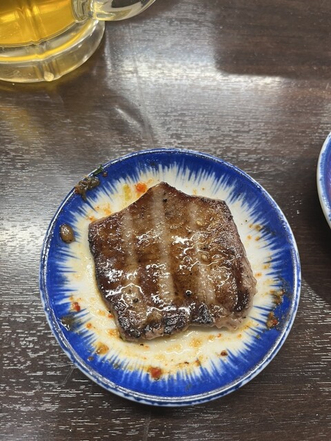 葉のようなとても綺麗な霜降りが入った大判の大きなミスジ。厚みも絶妙で、隠し包丁も入っています。ボーダーの焼き目が両面に付くように焼いたあと、ワサビを乗せて巻いて食べました。揉みダレではなくシンプルな醤油の味付けで、わさび醤油が肉の旨さを引き出し、しつこくない脂の美味さを上手く感じさせました。格別なミスジでした。