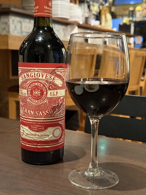 【今夜のお供③】Sangiovese Puglia Gran Sasso。サンジョヴェーゼはトスカーナ州を代表する黒ブドウ種。高めの酸味と繊細なタンニンが料理を惹き立てます。