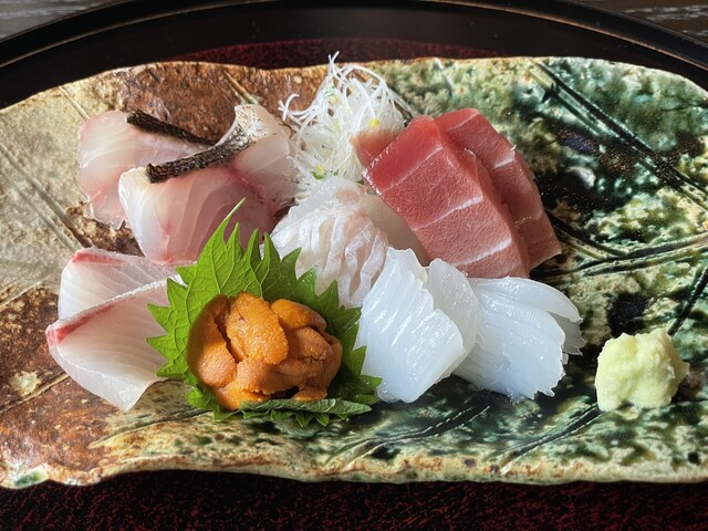 【お造り】手前から時計回りで相模のとらふぐ・金目鯛・炙り伊佐木・雲丹・勘八・障泥烏賊。