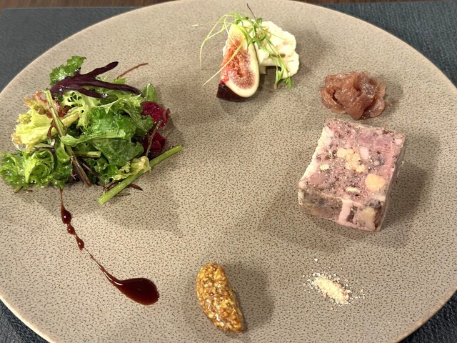【前菜】鶏白レバー・フォアグラ・牛ハツのテリーヌ、カスメリテイピクルスと無花果、タマリンドマスタード。
