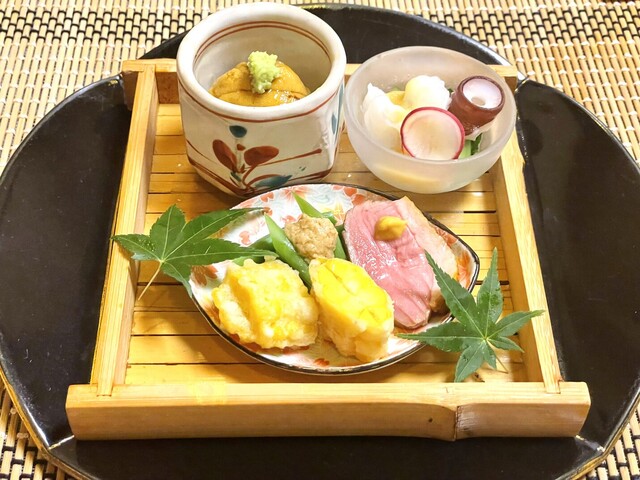 【前菜】奥から時計回りで、雲丹と生湯葉、蛸の酢の物、鴨肉ととうきびの揚げ物。2種類の蛸の食感は最高でした。