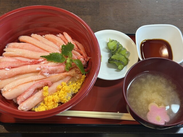 【本日のランチ①】カニ丼。ご飯が見えない程の紅ズワイガニが乗せられています。