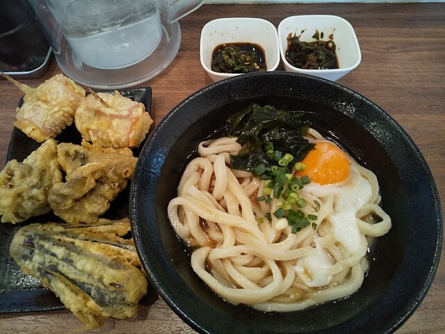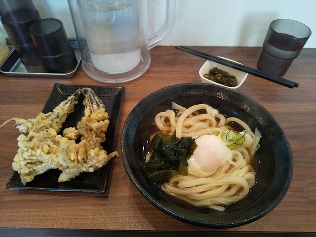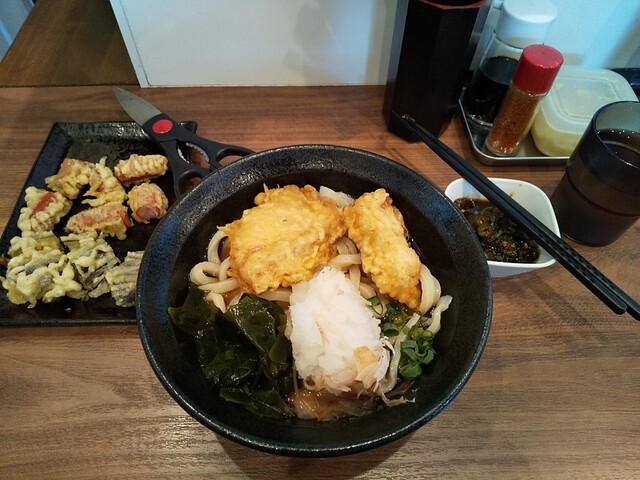 温玉ぶっかけうどん(温)+鶏皮ポン酢×2+青唐辛子醤油漬け×2