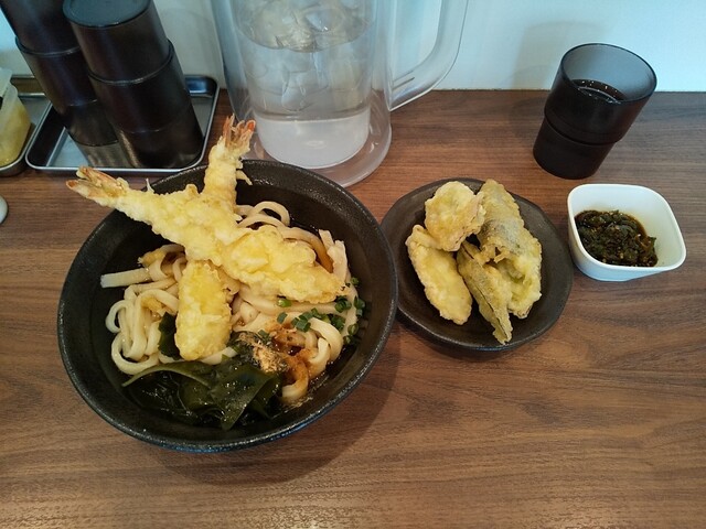海老天ぶっかけうどん(温)+鶏天+鶏皮ぽん酢+青唐辛子×2