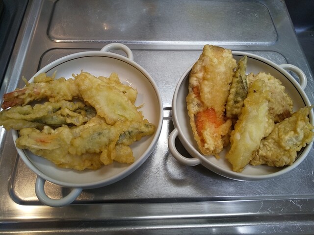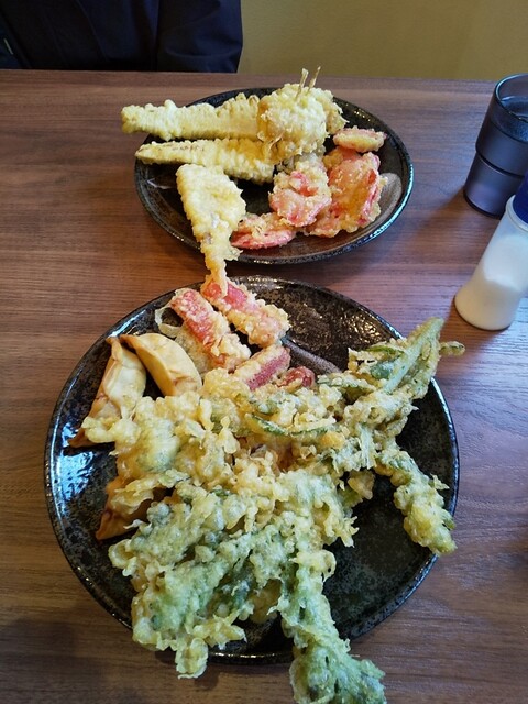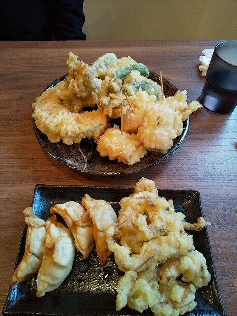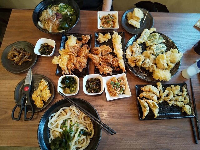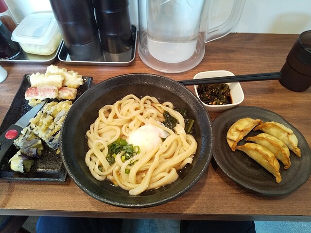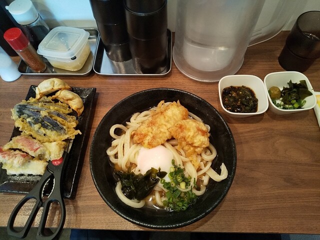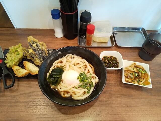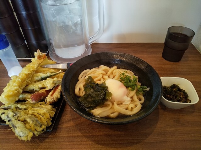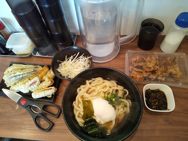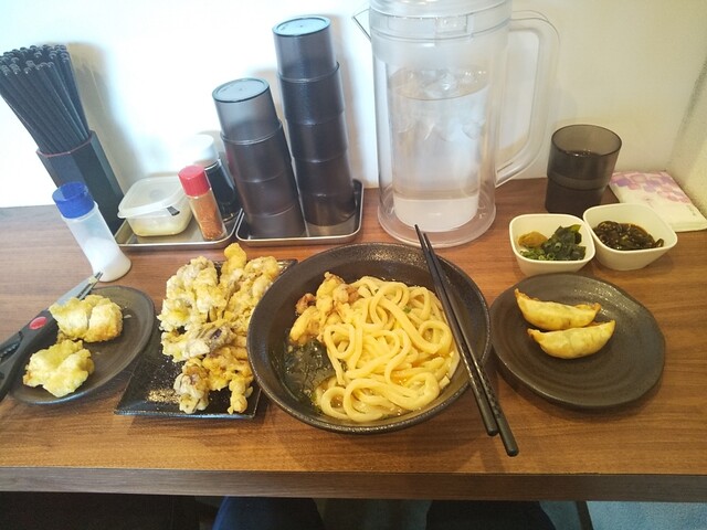 梅とろろ昆布うどん+鶏天温玉ぶっかけうどん+筍天+かき揚げ天+揚げ餃子×2(4個)+海老天×2+かぼちゃ天+舞茸天+青唐辛子×3+柚子胡椒トッピング