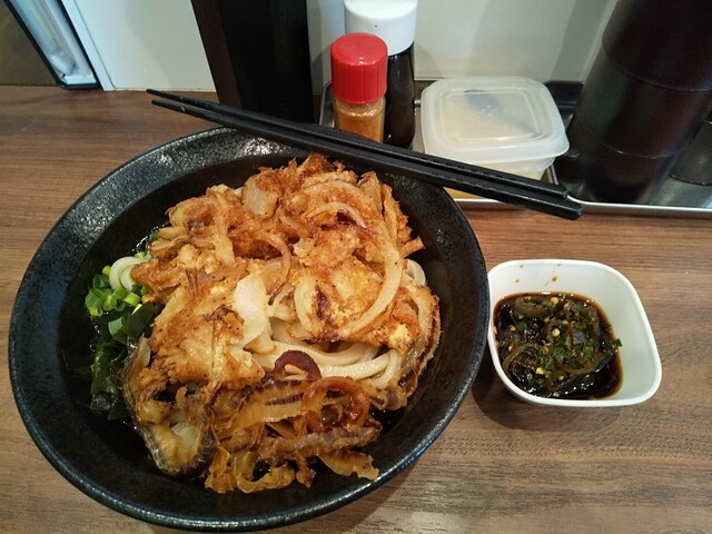 本日のうどん(玉ねぎとアミエビのかき揚げ、ぶっかけ温)+青唐辛子醤油漬け×2+焼き帆立の貝ひも(非天ぷらでうどんに追加トッピング・リクエスト)