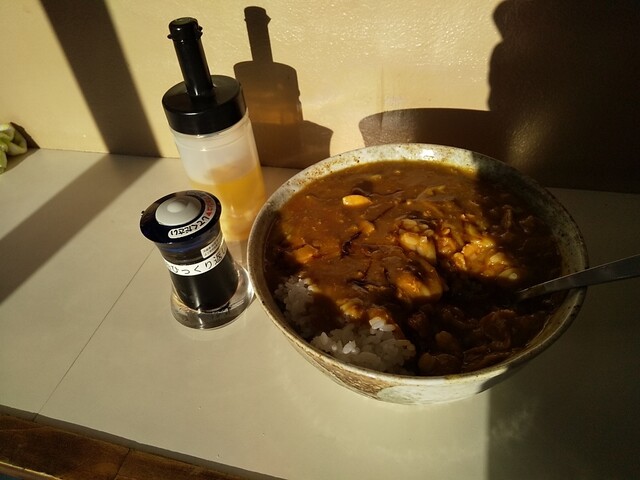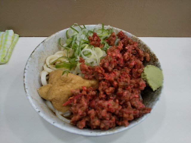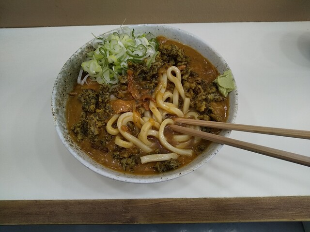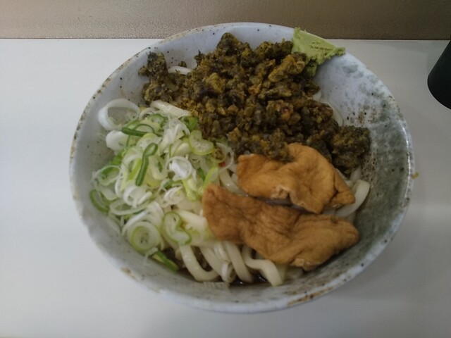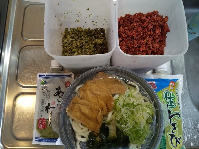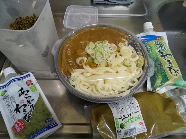つゆ無しカレーきしめんに青タバスコをぶっ掛けて食べました。