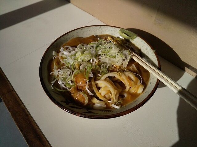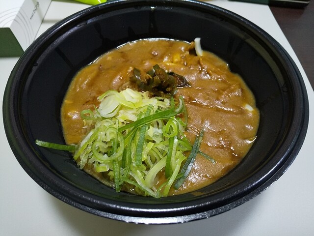 持ち帰り【汁なしカレーきしめん麺1.5倍】+自家製刻み青唐辛子のせ。