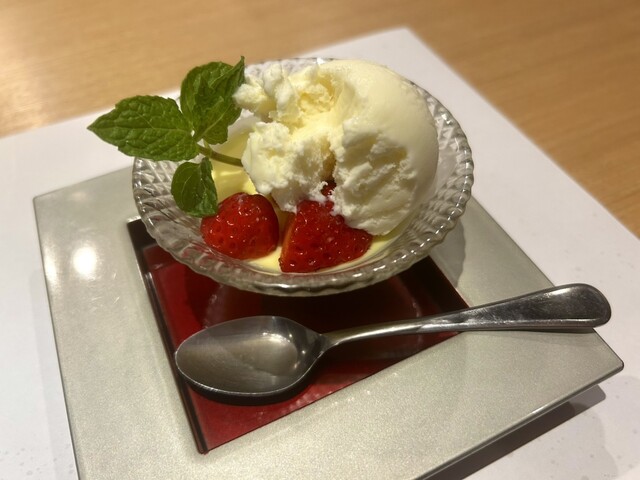 ラストのイチゴが添えられたアイスとカスタードのデザートも優しい甘さ
