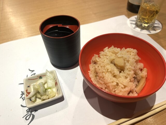 タケノコと牛肉の炊き込みご飯に、赤だしのなめこのお味噌汁が優しいお味