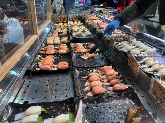 色々なお店が市場に集まっており、そこから寿司を選んでいくスタイル。面白い。寿司は基本一貫ごとに注文していく感じになる。