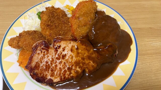 ポークソテー、ハンバーグ、ヒレカツ、ハムカツ、コロッケ、マッシュポテト