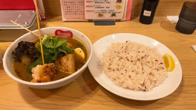 素揚げの野菜や、ブランド鶏、豚の角煮が乗っていて大満足でした