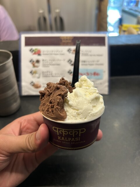 ジェラートはなんと2種類も頂けるようです。これで1950円はかなりお得だと思います。今回はカルダモンマスカルポーネラッシー味と花椒ショコラーデを頂きました。ジェラートにはスパイスが入っています。これが絶妙にマッチしています。普通に甘いのですがスパイスによって不思議な後味が残ります。特にショコラーデが美味しかったです。次回はチャイとココナッツに挑戦しようと思います。友達にも紹介しようと思います。