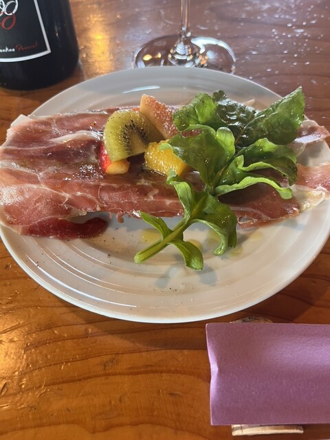 パンに乗った生ハムとイチジクやキウイを合わせて食べる前菜