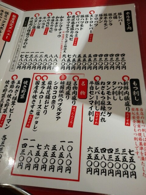 もつ刺しも新鮮だし(食感もよく、匂いもなし)、お肉も美味しかった。