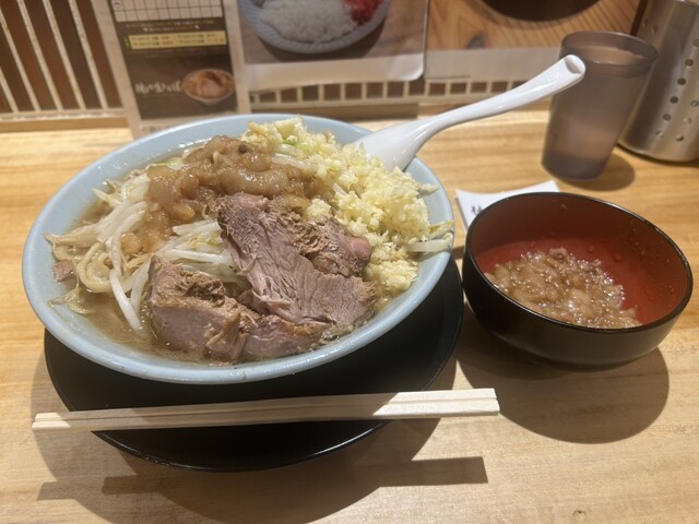 明日がやさみだし、ニンニク多めでオーダー。今回は辛味噌小ラーメンを選択。ヤサイ少なめ、ニンニクマシ。