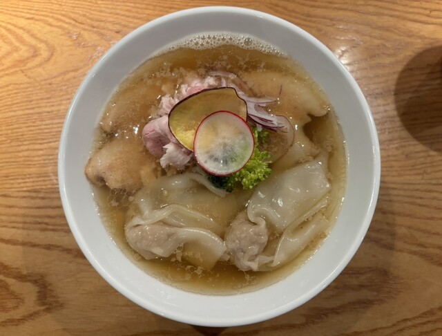 次のお店では醤油をいただくつもりでしたので、こちらでは塩にしようと決めていました。が、券売機を見てウワキ笑。数量限定 雲呑肉そば1450円 をポチりました。