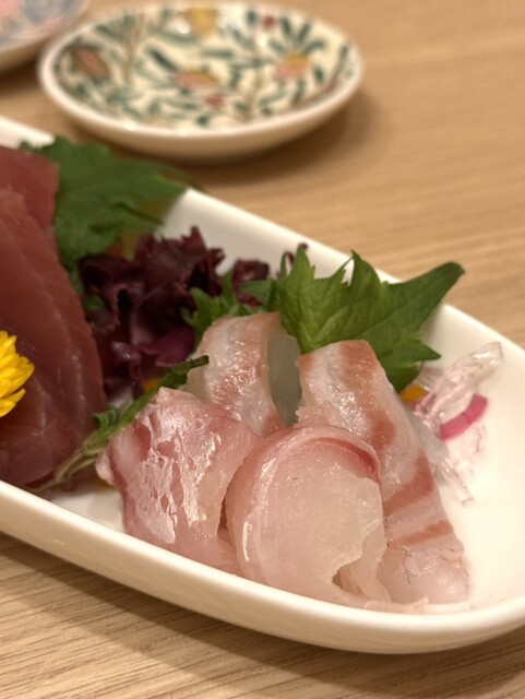 まぐろ、鯛、カツオの3種盛り合わせで