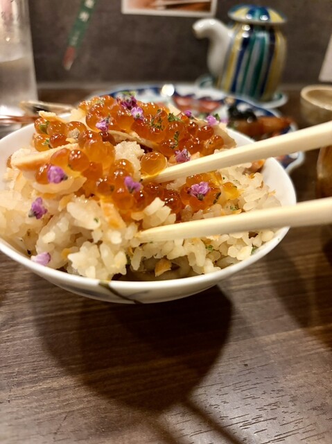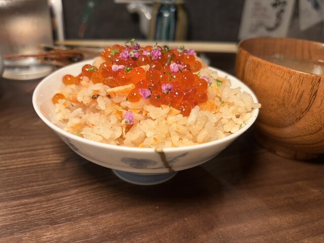 〆で出てきたご飯物、いくらと鮭の炊き込みご飯。ぷちぷちの弾けるいくらと、鮭のほんのりとした塩味に程よい炊き加減のご飯がベストマッチ!