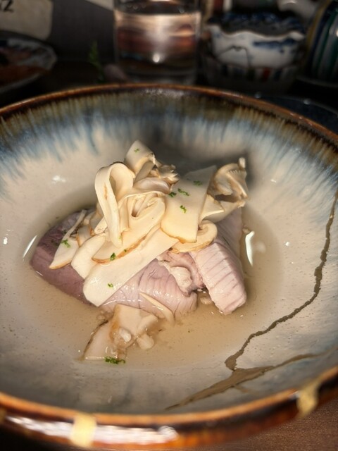 鮮度の高いぶりをレアでしゃぶしゃぶにして、その上から秋の味覚・松茸をスライスしたものを乗せた逸品。