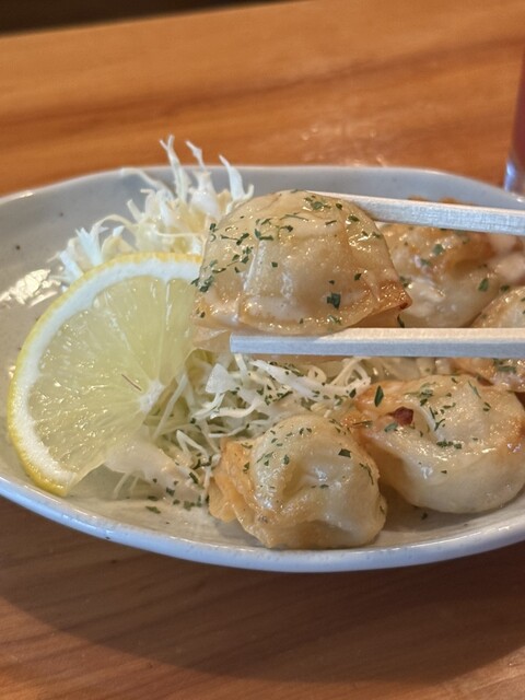 白身魚のフライみたいなのかと思ったら全然違う!餃子の皮に包まれたお魚がパリッと一口サイズで揚げられて、上にタルタルがサラッとかかってる感じ。