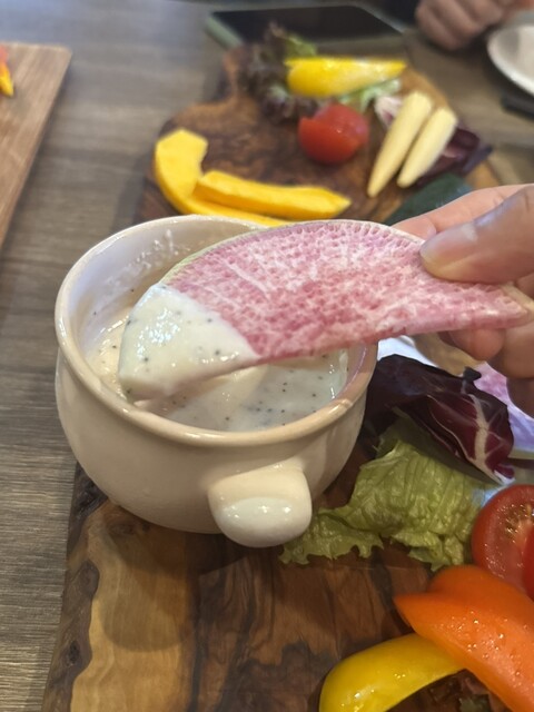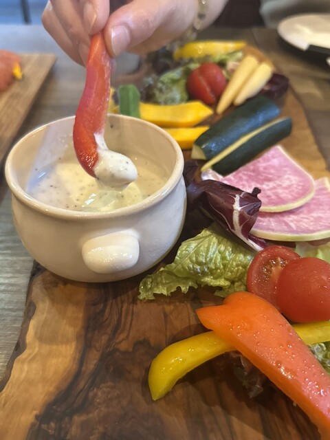 ソースは思ったよりあっさりめでむしろトリュフの風味が引き立つ!しつこくなくて繊細な味で良い!ベースはビシソワーズのような感じで冷たくて美味しい。さっぱり冷たいバーニャカウダ。サラダよりも野菜の素材感味わえていい!いやめちゃくちゃ好き!