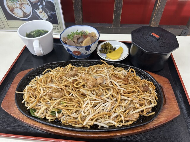大盛り焼きそばを注文熟練であるおばちゃん従業員たちが不手際よく運んできてくれます。サイドメニューのもつ煮込みは、ちょっと好みじゃなかったかなお腹いっぱいになりますよ。カリカリの美味しい焼きそばです