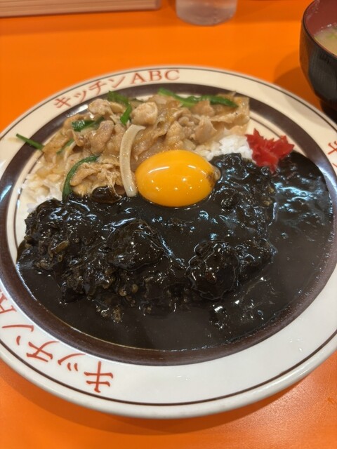 黒いカレーと肉の相性、さらに黄身を混ぜると合わない訳がない
