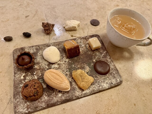 コースは一つ一つとても丁寧な説明をして頂けます。『『チョコレート以外で』』カカオの可能性を突き詰めたスイーツというテーマが本当に面白くてどれもみたことのない品々でした。スタッフの方もとてもご接客慣れしてる感じで、お客の方々一人一人としっかり対話しつつ時間をかけすぎないくらいにお気遣いされていて完璧でした。