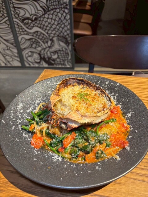 ・かにとほうれん草のトマトパスタは、もちもちの生パスタに蟹の旨みが凝縮したグラタンとトマトソースに、ほうれん草のバランスが良く、必ず食べたい逸品。