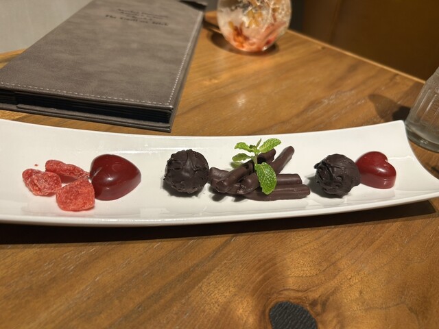 雪の降る東京の夜景を眺めながらまったりした時間を過ごしました。私はパフェ目的です。飴細工に金粉とバニラアイスといちご、ゼリーとイチジクで芸術的なパフェです。見た目がインパクト大なので一見の価値ありです