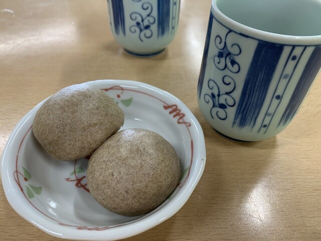 LINEのクーポンで蕎麦まんじゅうサービス。お茶は蕎麦茶です。