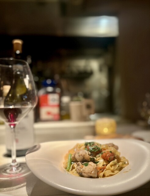 「大黒神島産カキとニンニクの芽のカルティエッラ」大ぶりでむちむちの牡蠣のコクと香ばしさが印象的で、食べごたえもありました。パスタは平打ち麺もチョイスできるのが嬉しい。しっかりとしている割に重たさがなく、するっと頂けます。