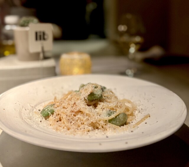 採れたてのそら豆のやさしい甘みに、削りたてのパルミジャーノの香りがもちもちのパスタと重なり、胡椒のキレも心地よく、春らしさを感じる一品。