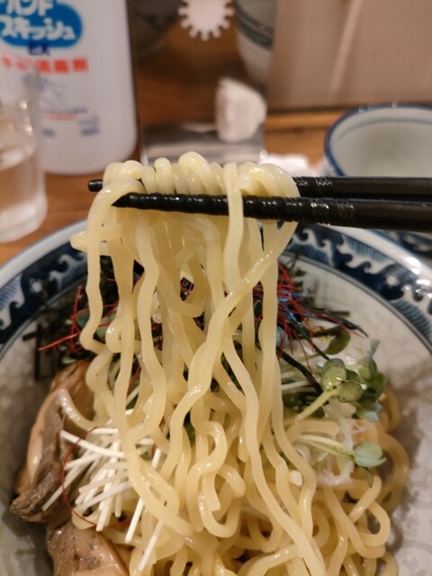 牡蠣のポタージュスープにコシの強い麺が合いますが、啜るときスープが飛び散るのでご注意を