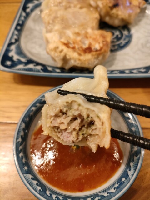 餃子は肉感が強く出てます、つけダレは辛味噌と黒酢選べますが辛味噌を選択しましたが、味噌と辣油と砂糖を組み合わせたやや辛めのタレです。餃子自体はやや脂っぽい感じでした。