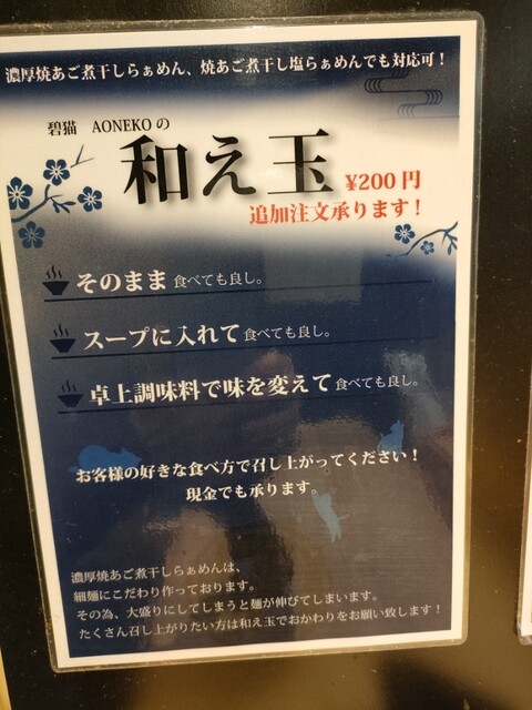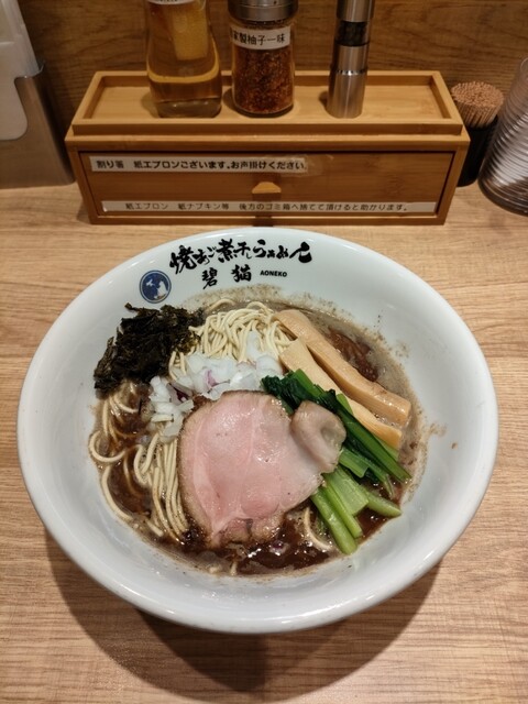 アオサ、玉ねぎ、メンマ、チャーシュー、麺完食後のスープ割したスープをレンゲにすくい卓上の果実酢、七味、ブラックペッパーで味変しながら楽しむのがマイルール
