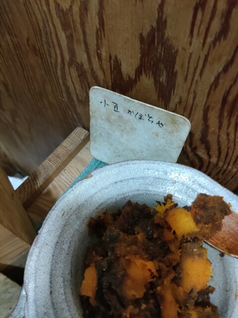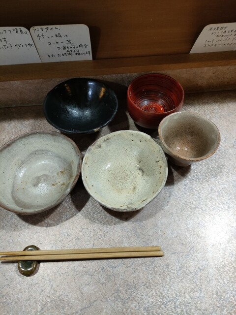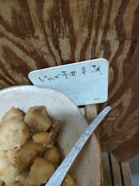 骨董屋さんぽい入口を抜け店内に入ると女店主がカウンター内からお出迎え、初めてか聞かれそうだと答えると入口脇のおばんざいと味噌汁を自分で取り、ご飯は店主が提供するシステムそれで1200円ですが宜しいかと聞かれます。因みにお代わりは自由なようです。