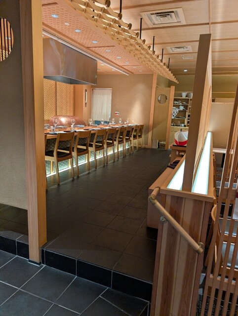会食で大丸心斎橋の圓堂さんへ。コスメのフロアから10階直通EVでゴー!清潔感あふれるエントランスを抜けると開放感のあるカウンターとテーブル。